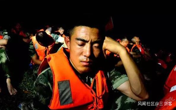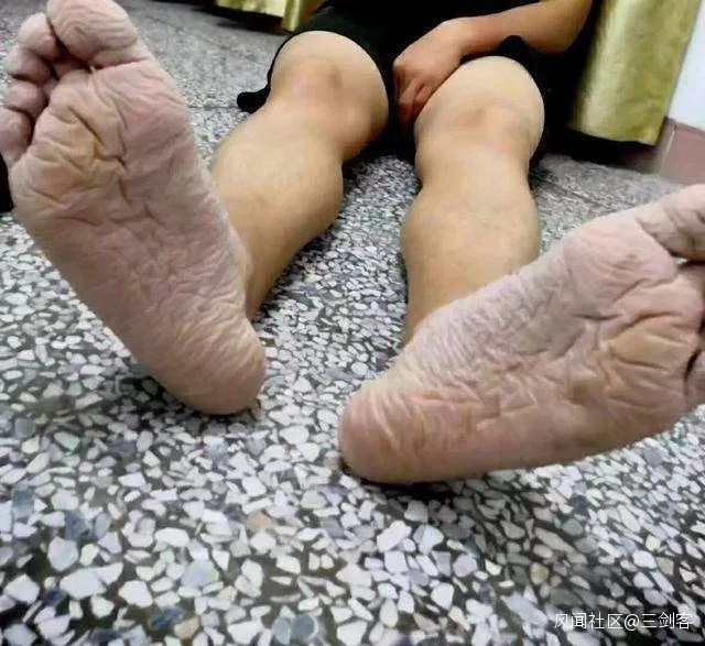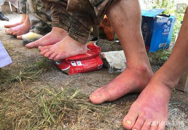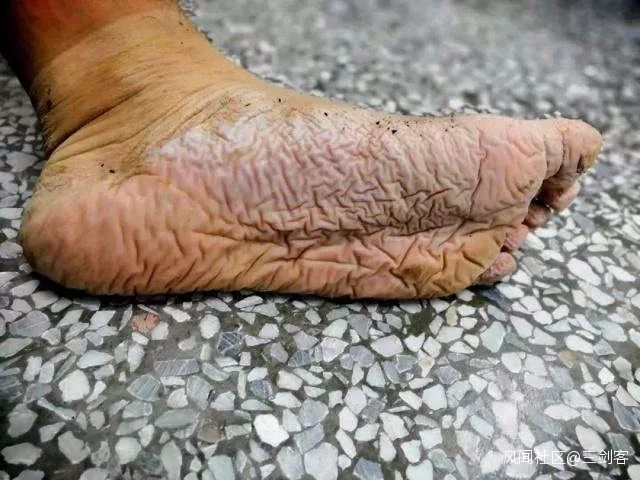 文中的第一張照片,是一隻已經被泡的發白、褶皺、浮腫變形的腳,一支屬於武警戰士的大腳。