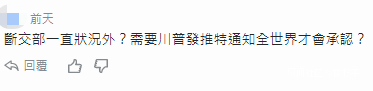 對《華爾街日報》網站這次爆料,台“外交部長”吳釗燮在報道刊出第二天急忙進行回應,聲稱“沒有聽説這樣的事情”。不過,有島內網友批評了吳釗燮的説法,還質問台“外交部”是不是一直“狀況外”,非得等特朗普發推特才承認。