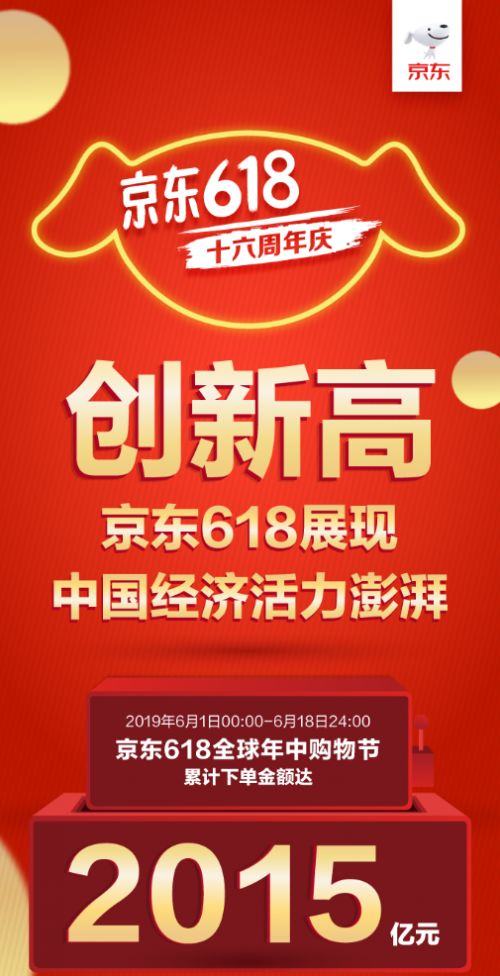 618當日24點,各大平台都紛紛發佈再創新高的各種消費數據,結果果然不負眾望。以京東為例,從6月1日0點到6月18日24點,累計下單金額創下2015億元的驚人數字。