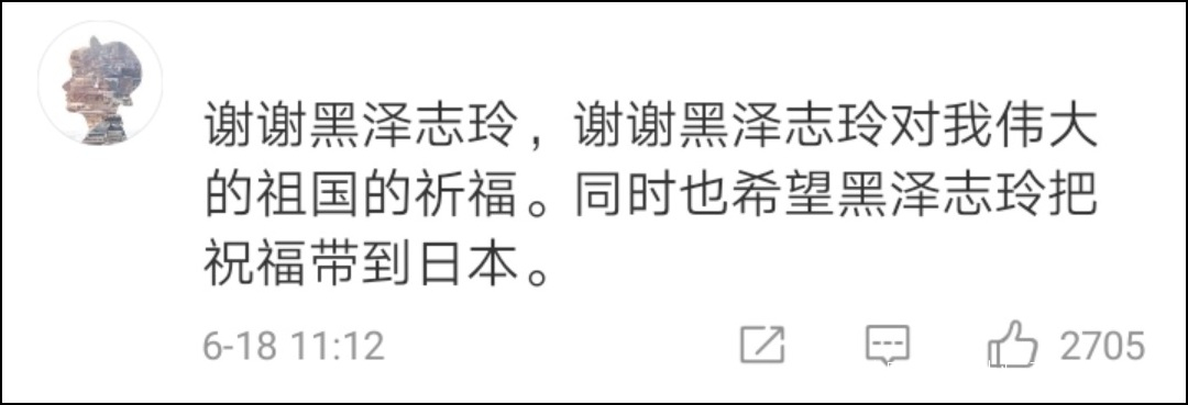 主要原因在於她嫁給一個日本人之後,有消息傳出來她可能會改姓“黑澤志玲”,這樣的一則消息在第一時間觸動到了大家的神經,很多網友更是表示如果真的是這樣的話在很大一種程度上她就不再是“自己人”了!因此她的微博下面有很多態度激進的網友留言説請把祝福留給日本。