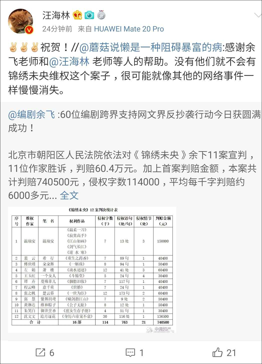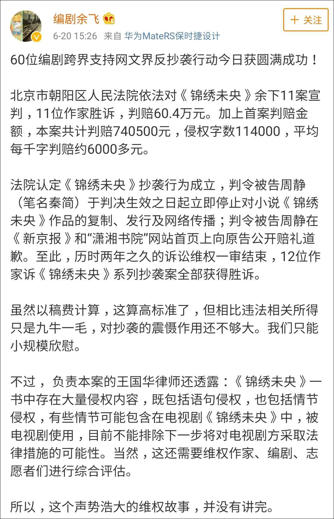 北京市朝陽區人民法院依法對《錦繡未央》餘下11案宣判,11位作家勝訴,判賠60.4萬元。加上首案判賠金額,本案共計判賠740500元,侵權字數114000,平均每千字判賠約6000多元。