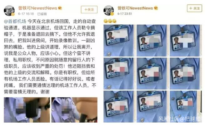 19日,北京出入境邊防檢查總站官微發聲,直指“曾某某不配合面相對比,對民警爆粗”,且對於“曾某某在網上披露我單位民警個人信息及照片,對民警身心造成嚴重影響的侵權行為,保留法律追究的權力”。緊隨其後,國家移民管理局官微和公安部新聞中心微博也相繼發聲,並拋出“國門神聖,法律莊嚴”擲地有聲的問責。