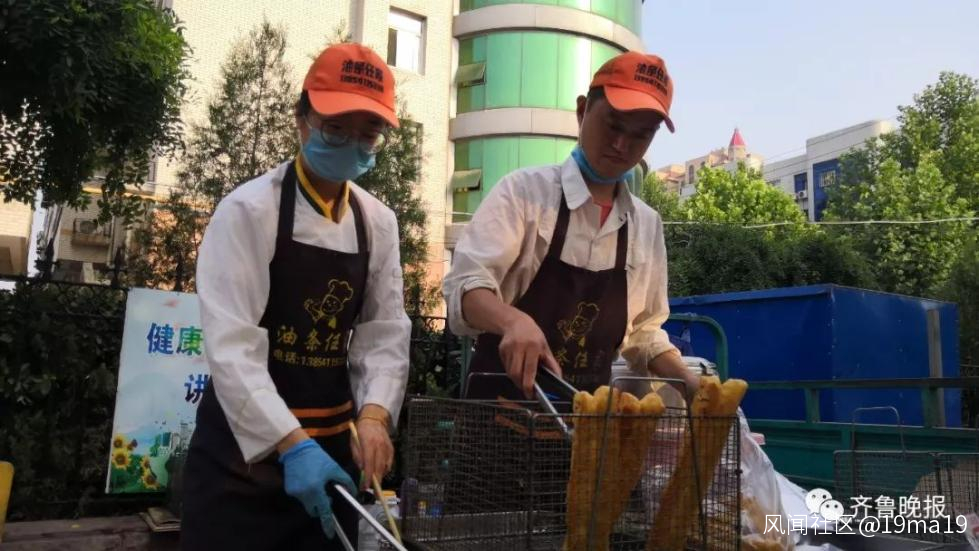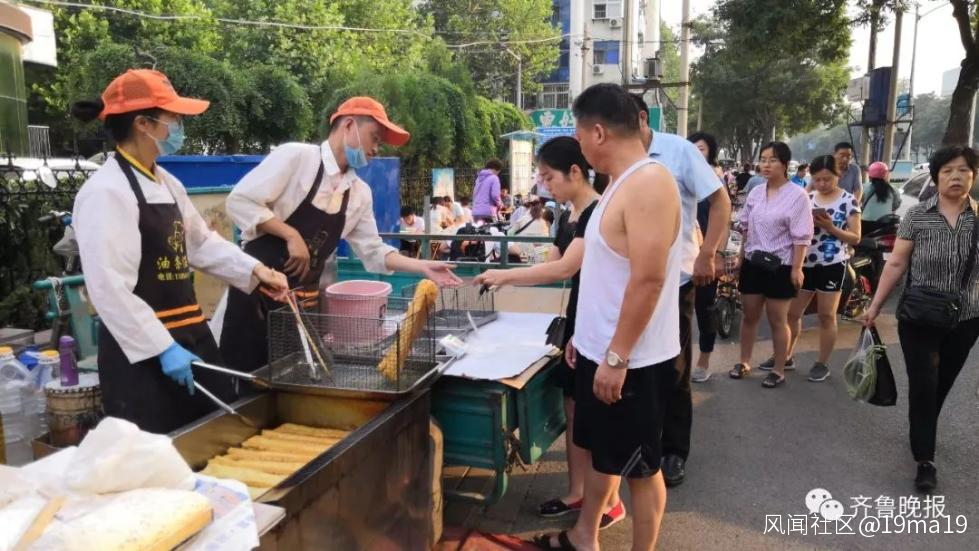 6月18日早上6點半,記者在見到了正在濟南市長清區水鳴街便民市場擺攤賣油條的任曉猛、任文亞,他們忙活着炸油條和收錢,而早攤點則排起了很長的隊。