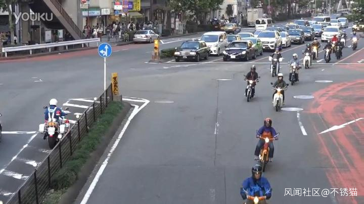 摩托車仍是日本民眾出行的重要交通工具之一,所有人都戴着頭盔,所有人都沒有亂併線,哪怕是摩托車,都在綠燈放行車道里走得整整齊齊。