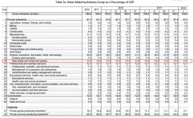 此後的2016年到2018年,美國的房地產一直佔美國GDP的13.4%左右。