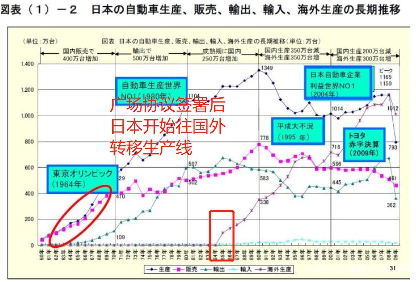 把工廠開到外國,日本的工人只能失業了。從1985年開始,日本汽車的海外生產量逐漸上升。
