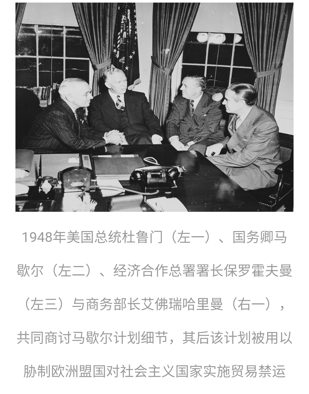 同時,美國又修改《經濟合作法》(Economic Cooperation Act),威逼“馬歇爾計劃”(The Marshall Plan)的歐洲受援國也得對蘇禁運,否則將斷絕援助。美國政府毫不客氣地表示“應該儘可能使西歐各國接受美國安全清單”,力圖使各國按照美國標準擴大對蘇禁運。儘管東西歐之間原本有緊密的貿易往來,西歐各國尤其急需東歐的糧食、木材、煤炭等物資,但因二戰受創甚深,無力抵禦美國的軟硬兼施,最後不得不配合。結果此舉不僅加劇冷戰雙方的隔閡,還使西歐加深對美國的經濟依賴,令美國的地位更形鞏固。 但美國認為,光憑自身立法與威嚇還遠遠不足,決意串聯盟國構築更完整的經濟鐵幕。1950年1月,“輸出管制統籌委員會”(Coordinating Committee for Multilateral Export Controls)秘密成立,其總部設於美國駐法大使館內,又稱“巴黎統籌委員會”。美、英、法、意大利、荷蘭、比利時乃創始會員國,其後又有挪威、加拿大、聯邦德國、葡萄牙、日本、澳大利亞相繼加入,共同對蘇聯陣營禁運戰略物資和原子能物資,以及限制輸出工業製品,且組織的存在、活動、文件,成員國都不得對內外曝光,以佔據維護“自由貿易”體系的道德高地和避免蘇聯陣營反彈。1951年,美國又修正通過《共同防衞援助法》(Mutual Defense Assistance Act),規定若有任何國家向蘇聯陣營出口美國規定的禁運物資,美國將停止所有援助,以此向各國提高禁運的壓力。 至於同為社會主義陣營的中國,美國早在國共內戰結束前就評估,利用對華貿易離間中蘇關係,但也明令一旦此舉失敗,將“動員西方世界的政治和經濟力量,通過恫嚇和直接威脅,公開與中共政權作鬥爭”,因此美國起初只實施對華武器禁運。但是當1950年朝鮮戰爭爆發後,美國立刻對朝鮮、中國、以及當時尚處於殖民下的香港和澳門實施出口許可證制度,同時還擴大巴黎統籌委員會的禁運清單,並又在1951年向聯合國提案通過“對中華人民共和國中央人民政府及北朝鮮政權統治下之地域實行禁運軍械、彈藥、軍用品、原子能材料、石油、具有戰略價值之運輸器材以及可用以製造軍械、彈藥軍用品之物資”決議,不再圖謀同中共改善關係。美國還宣稱“凡是一個士兵可以利用的東西”都不許運往中國,企圖堵死中國的軍事與經貿。 巴黎統籌委員會還另於1952年8月設立中國委員會,實行比對蘇聯陣營更嚴格的禁運清單。比如成員國若非得需要蘇聯陣營的某些物資,可憑“例外程序”輸出部分管制品,但對中國則嚴厲審核,形成“中國差別”( China Differential)。美國也另對南斯拉夫聯盟實施較寬鬆的“南斯拉夫差別”待遇,甚至刻意提供援助,希冀以此分化社會主義國家。且當1954年巴黎統籌委員會將總數高達474種的管制清單調降至252種時,唯獨對中國仍有472種之多。美國政府毫不掩飾地吐露何以對華異常嚴苛:“對共產黨中國的貿易管制,不僅要阻礙其戰爭潛力本身的增長,而且還要阻礙其工業化,對歐洲蘇聯集團的貿易管制,則只是要阻礙其在歐洲戰爭潛力的增長”,凸顯其動機並非只是單純壓制中國軍力,而是全方位遏制中國發展。