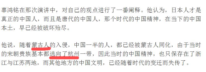 “在亡清時代,辜氏是一個維新派。不過在宣統遜位的時候,他還是西裝剪髮,他便馬上戴了假辮子,穿上長衣馬褂,叫黃包車伕拉着巡遊北京城,結果給警察拉到了警區去!”