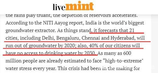更可怕的是,有印度媒體提供的研究數據還顯示,如果照目前的情況發展下去,到2020年時印度將有21個城市的地下水被耗盡,到2030年時40%的印度人甚至將無法獲得飲用水。