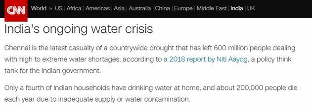 因此,從CNN等媒體提供的數據來看,目前印度的水危機已經到了一個極為危險的地步。比如目前印度竟有多達6億人正在和高度甚至極度的缺水問題做鬥爭,整個印度只有1/4的家庭在家中有飲用水,還有20萬人每年會因為水供應不足或污染問題而喪命。