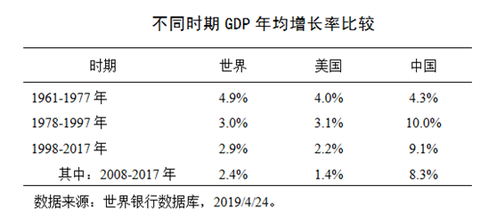 其實,對中國經濟總量超越美國的時間進行預測是很容易的事。我們不妨先以1960年為基期,把過去半個多世紀全球經濟與中美經濟增長情況分為3個時間段,即1961-1977年(共17年)、1978-1997年(20年)、1979-2017年(20年),考察不同時期的年均GDP增長率。
