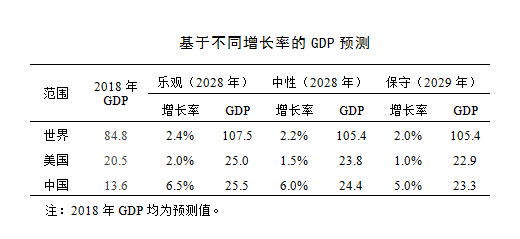 參照歷史數據及變化趨勢,我們可以依據2018年不變價美元,在不考慮各國匯率變動因素且假定的樂觀、中性、保守三種情況下,分別對中國經濟超越美國的時間作出預測(見下表)。結果顯示,在樂觀的情況下,中國GDP將於2028年超越美國,屆時中、美經濟全球佔比分別為23.7%、23.2%;在中性的情況下,中國GDP也是於2028年超越美國,屆時中、美經濟全球佔比分別為23.1%、22.6%;在保守的情況下,中國GDP將於2029年超越美國,屆時中、美經濟全球佔比分別為22.1%、21.7%。