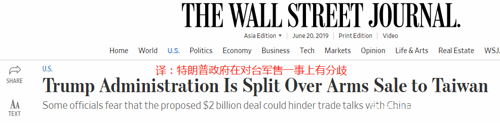 美國《華爾街日報》網站6月17日刊出一篇題為《特朗普政府就對台軍售一事有分歧》的報道。