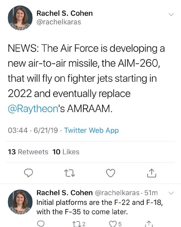 根據美國酒桌黨,《美國空軍雜誌》高級編輯,Rachel S. Cohen大姐發佈的,根據他的説法,洛馬AIM-260 JATM聯合先進戰術導彈,最終替代AIM-120 AMRAAM。初始裝機對象是F-22(彈艙內置)和超級大黃蜂,F-35隨後。2021年開始飛行試驗,2022年開始服役。