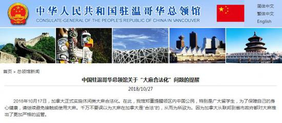▲中國駐温哥華總領館關於“大麻合法化”問題的提醒