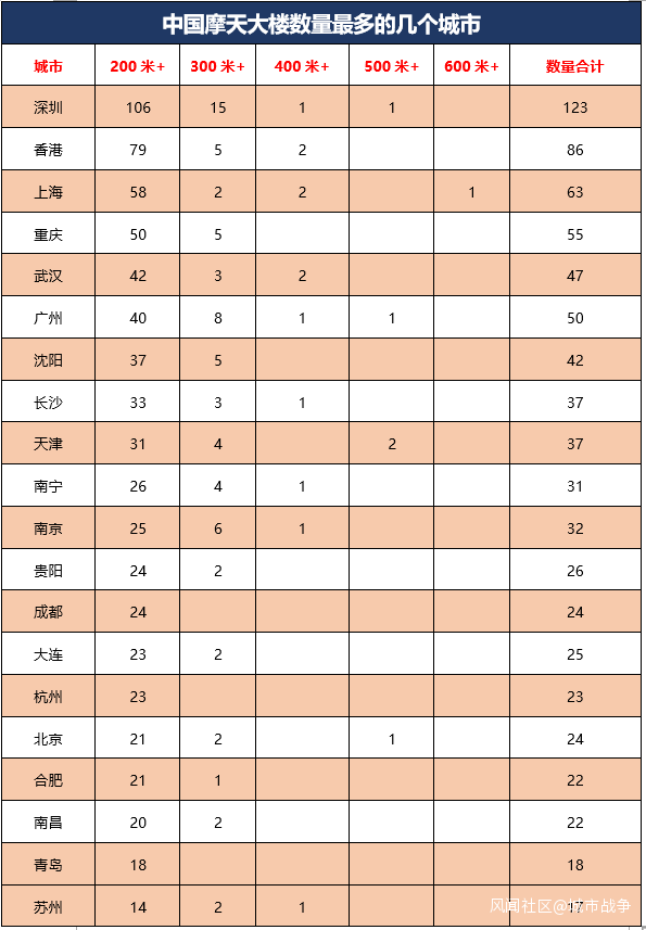 可能超乎很多人的意料,300米以上高樓其實非常稀缺,因摩天大樓而著稱的上海只有5棟,首都北京也只有2棟,可見300米是個很高很高的門檻,下面簡單解讀一下: