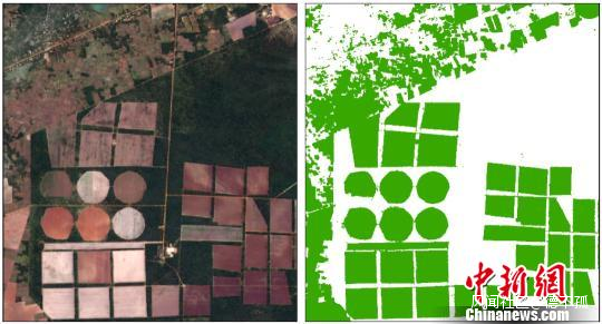 贊比亞銅礦省部分農場遙感影像(左)與耕地提取結果(右圖綠色範圍)。 中科院空天院/供圖
