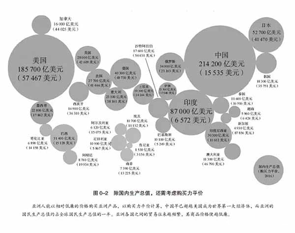 亞洲人再一次將自己視為現在及未來世界的中心。亞洲經濟圈包括西部的阿拉伯半島和土耳其,東部的日本和新西蘭,北部的俄羅斯以及南部的澳大利亞。現在,亞洲經濟圈佔全球國內生產總值的 50%,同時佔有全球經濟增長 2/3 的份額。世界中產階級的消費有望在 2015-2030 年增加到 30 萬億美元,其中歐洲的中產階級預計只佔1 萬億美元,其餘的絕大部分都來自亞洲。亞洲無論是生產、出口還是進口、消費的商品數量都超過其他地區, 亞洲各國也多與其內部國家(而非歐洲和北美)進行貿易和投資。亞洲擁有幾大世界經濟體,持有大部分世界外匯儲備,經營着許多大型銀行以及工業、科技公司,同時也坐擁世界上最強大的軍隊。全球 60% 的人口都分佈在亞洲,這是歐洲總人口的 10 倍,北美總人口的 12 倍。隨着世界人口逼近 100 億,亞洲的總人口將永遠多於其他洲人口的總和。他們現在擁有了發言權,讓我們準備好從亞洲人的角度看世界。