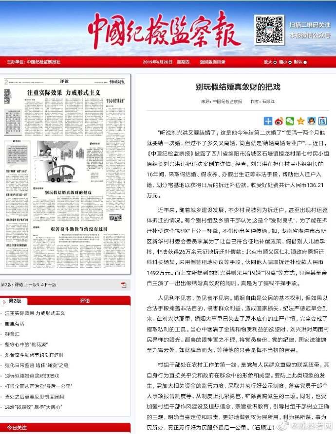 “聽説劉興洪又要結婚了,這是他今年結第二次婚了”“每隔一兩個月他就要結一次婚,但過不了多久又離婚,簡直就是‘結婚離婚專業户’”……近日,《中國紀檢監察報》披露了四川省綿陽市涪城區石塘鎮蟠龍村第七村民小組原組長劉興洪違紀違法案例的詳情。經查,劉興洪在擔任村民小組組長的16年間,採取假結婚、假收養、辦假出生證等非法手段,幫助他人遷户入籍、劃分宅基地以獲得日後的拆遷補償款,收受好處費共計人民幣136.21萬元。