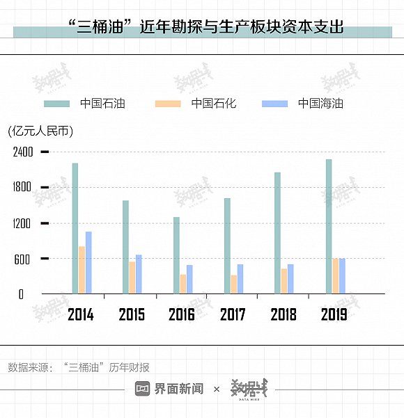 以煉化和成品油銷售為主的中國石化(00386.HK),成為“三桶油”勘探開發板塊投資增幅最大的企業。2019年,中國石化勘探開發資本支出596億元,同比增加41%,增加的支出重點為勝利油田、西北油田、涪陵頁岩氣、威榮頁岩氣等油氣產能建設等。