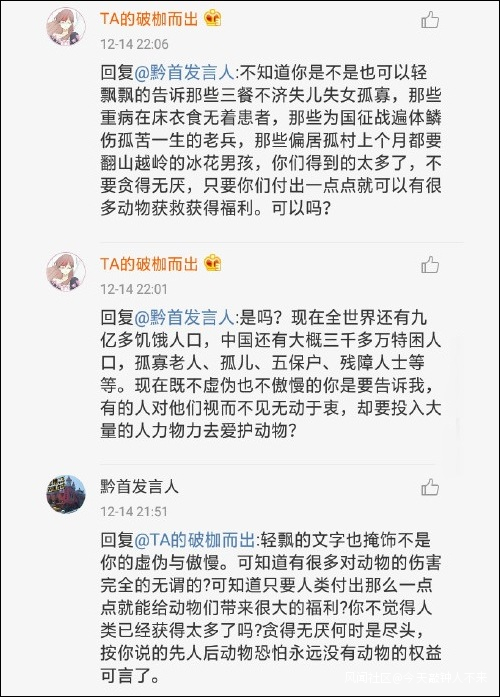 去年12月,@黔首發言人 在與一位網友辯論時就提到:“你不覺得人類已經獲得太多了嗎?貪得無厭何時是盡頭……”