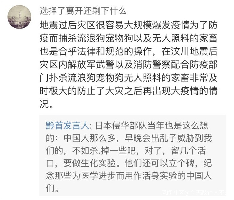 如果此前的討論還處於相互爭辯的地步的話,那麼下面這一位網友@黔首發言人 的言論就已經是令人髮指了。在他看來,人狗同命,防疫工作固然重要,但是狗的性命也要保護。同時他還拿災後防疫與日本侵華部隊展開的生化實驗進行比較,認為二者相當。