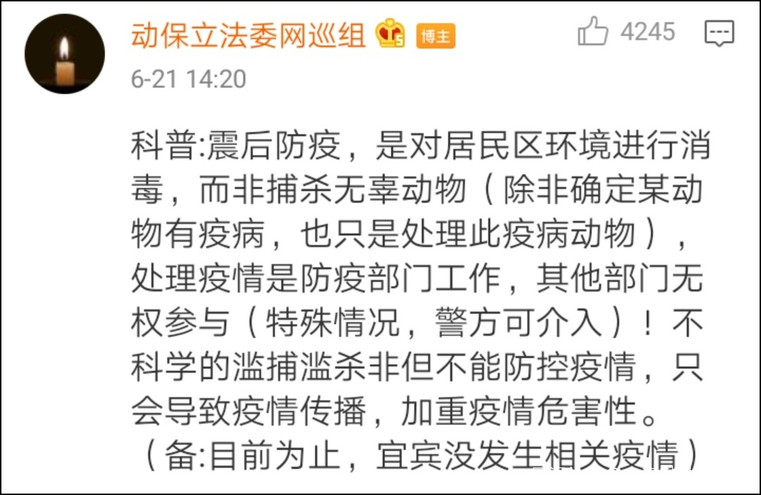 隨着宜賓地震逐漸過去,政府部門針對災區的工作重點也由救援轉向災後重建。不過,在此之前還有一項必不可少的工作要展開,那就是災後防疫。不過,日前卻有多個動保博主在社交媒體上對於宜賓市城管部門撲殺流浪狗的行為表達不滿,由此引發關注和討論。