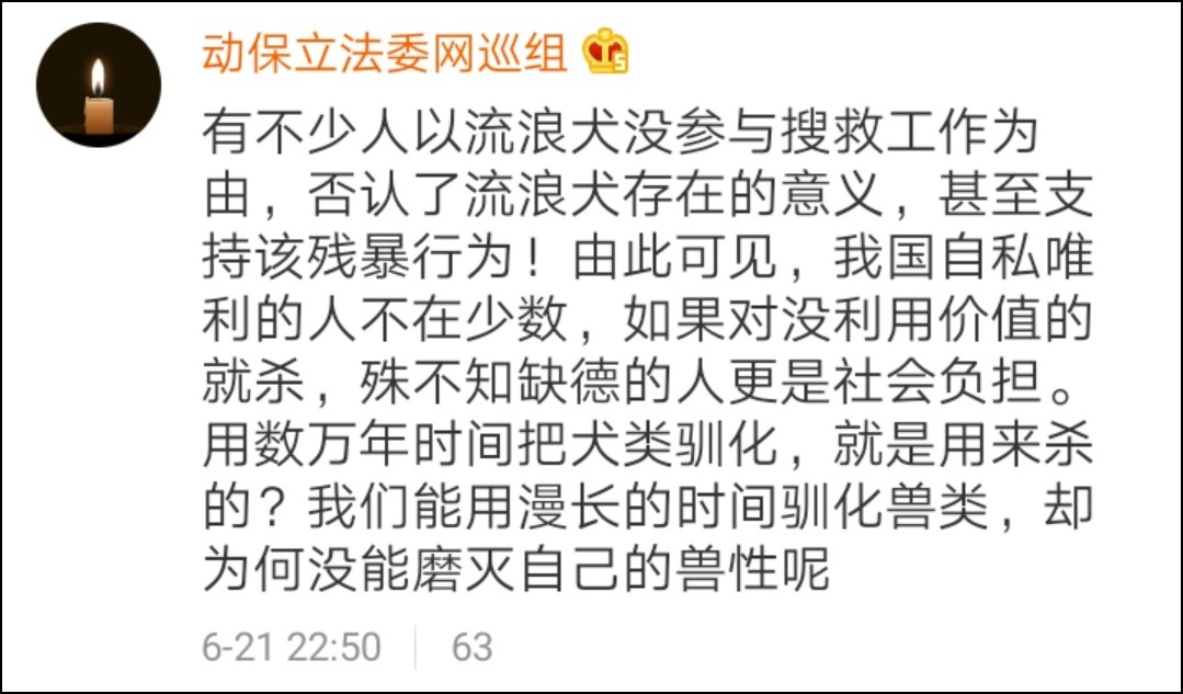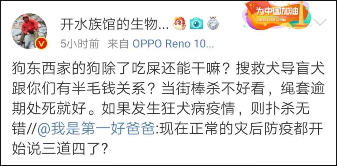 如果有人站出來批駁他們為什麼不把目光投向自己的同類,這些動保博主倒是振振有詞地認為,人類已經向這個地球索取過多,是時候做出犧牲進行回報。這種犧牲自然是包括獻出生命,因此他們能夠對流浪犬隻傷人視而不見,能夠對災後的防疫工作大放厥詞……只是因為他們覺得人命可以被輕賤。