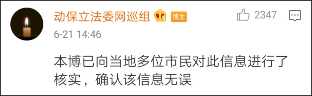 其中一位影響力比較大的博主@動保立法委網巡組 還特別強調,他已經向宜賓當地網友進行求證,確認消息屬實。