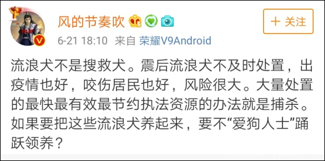 在他看來,流浪狗是無辜動物,在沒有確認其身上攜帶疫病之前,就不應該介入處理。他還表示,即使要做防疫工作,也應該是防疫部門進行主導,特殊情況下,警方也可以參與進來,而不是由城管部門來進行。由此,這個博主總結認為,“不科學的濫捕濫殺非但不能防控疫情,只會導致疫情傳播,加重疫情危害性。”