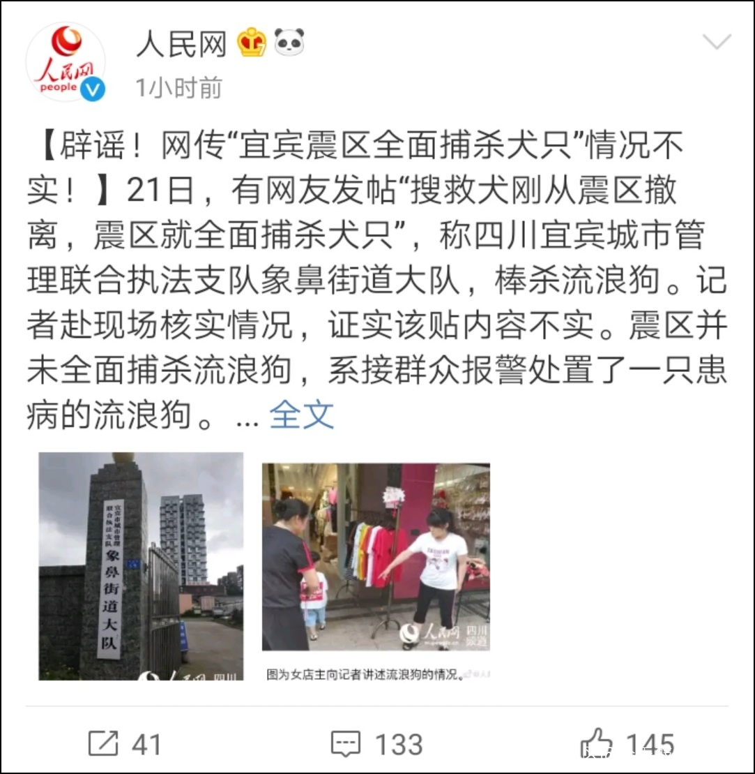 據人民網報道,21日,有網友發帖“搜救犬剛從震區撤離,震區就全面捕殺犬隻”,稱四川宜賓城市管理聯合執法支隊象鼻街道大隊,棒殺流浪狗。記者赴現場核實情況,證實該貼內容不實。震區並未全面捕殺流浪狗,系接羣眾報警處置了一隻患病的流浪狗。
