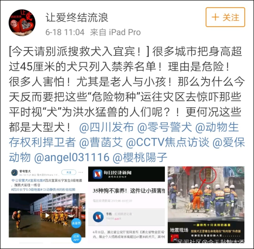 這不僅讓筆者想到了,數天前,還有人發文呼籲別讓搜救犬進入宜賓參與救災: