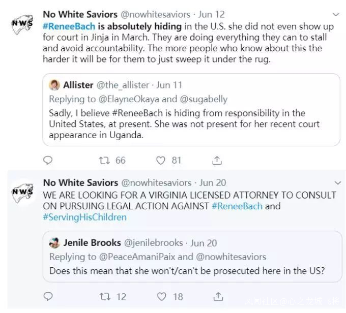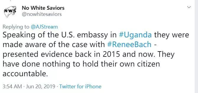 對此,烏干達很多網民都要求將這個涉嫌害死100多名兒童的美國人繩之以法,而目前在協助受害者維權的“拒絕白人救世主”(No White Saviors)團體則懷疑她已經躲回到了美國,並打算在美國也對她提起訴訟。