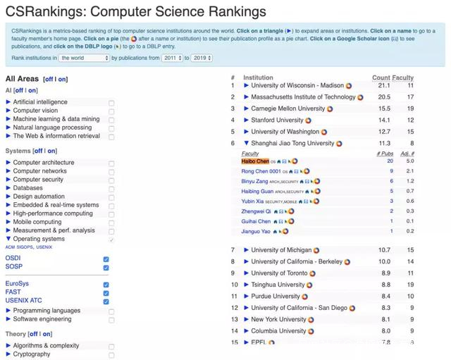 2011年底,留校任教的陳海波決定離開復旦,來到了上海交大。這之後,陳教授拉着從沒排進過前20的交大,在操作系統研究的國際榜單上一路狂奔。csranking的數據顯示,交大在11年-19年之間從籍籍無名,一路衝到了全球第6。而在交大校內,陳海波團隊的論文數量,跟第2、3、4名團隊的論文數之和一樣多。
