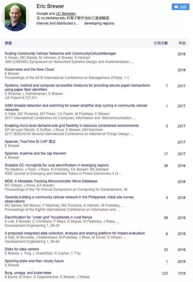 作為一個簡單的對比,我們還查了查OS全球百人名人堂裏,排名比陳海波更高的Eric A. Brewer。單就論文數量而言,他16、17、18三年的署名論文數量分別為8、5、1篇,遠遠沒有陳教授這麼“玩命”。
