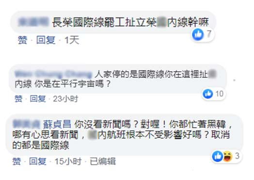 不過,蘇的解釋引來了島內網友的又一陣吐槽:長榮罷工停的是國際線,扯島內線幹嘛?你是在平行宇宙嗎?“蘇貞昌,你沒看新聞嗎?對喔!你都忙着黑韓國瑜,哪有心思看新聞?”↓