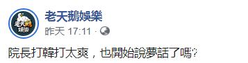 島內臉書粉絲專頁“老天鵝娛樂”21日發佈了這樣一張圖片,並配文解釋道,“長榮空服員發動罷工,‘行政院長’蘇貞昌表示,‘國防部’若有必要會出動軍機等提供各種必要協助,確保旅客權益。”“老天鵝娛樂”還諷刺稱,“‘院長’打韓打太爽,也開始説夢話了嗎?”