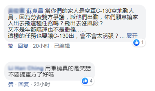 對於有網友稱,軍機也可指C-130運輸機時,有網友怒問,因勞資雙方爭議派空軍出勤,會不會太誇張?用軍機真的是笑話,不要搞軍方了好嗎?↓