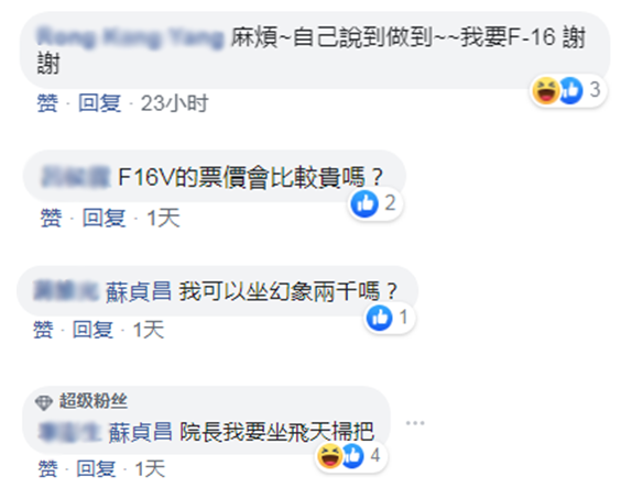 也有網友諷刺蘇貞昌稱,麻煩説到做到,我要F-16;我可以坐幻象2000嗎?我要做“飛天掃把”↓