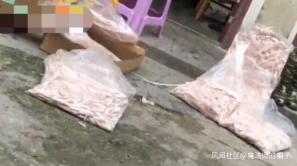 八袋雞爪很隨意的被扔在地上,血水順着沒有密封的口袋流了一地,蒼蠅在雞爪上盤旋,像是它們的天堂。