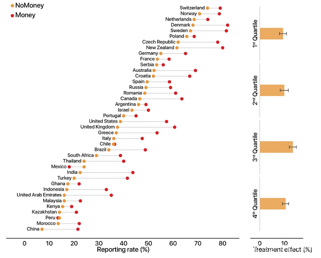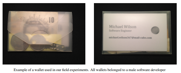 在這篇報告中,研究人員在全球40個國家的355個城市進行實地研究,他們在公立和私人機構交付了17,303個“撿到的”錢包,並且統計有多少人通過預留的聯繫方式反饋給研究人員的郵箱。