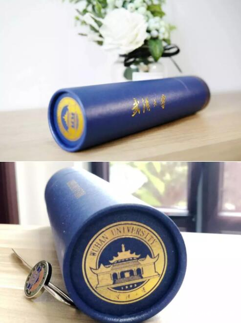 畢業生禮盒,採用書畫筒樣式的外包裝,鎏金燙印校名和校徽。