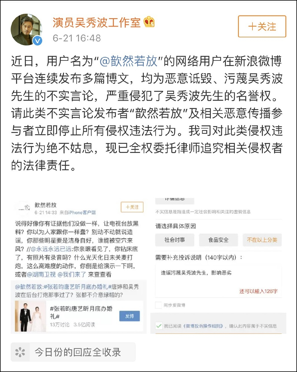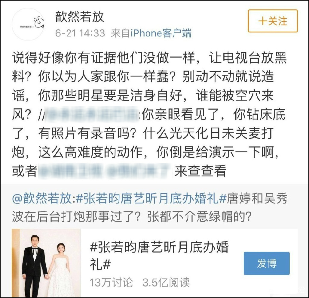 根據吳秀波工作室曬出的截圖顯示,張若昀唐藝昕月底結婚消息公佈後,有網友發文散佈女方與吳秀波的不實言論。對此,吳秀波工作室發文稱已委託律師追究該網友的法律責任。