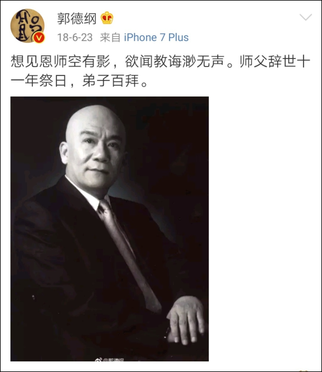 這些年,每年的6月23日,郭德綱都會在個人社交網絡平台發文緬懷侯耀文,這份情深義重的師徒情令人肅然起敬。