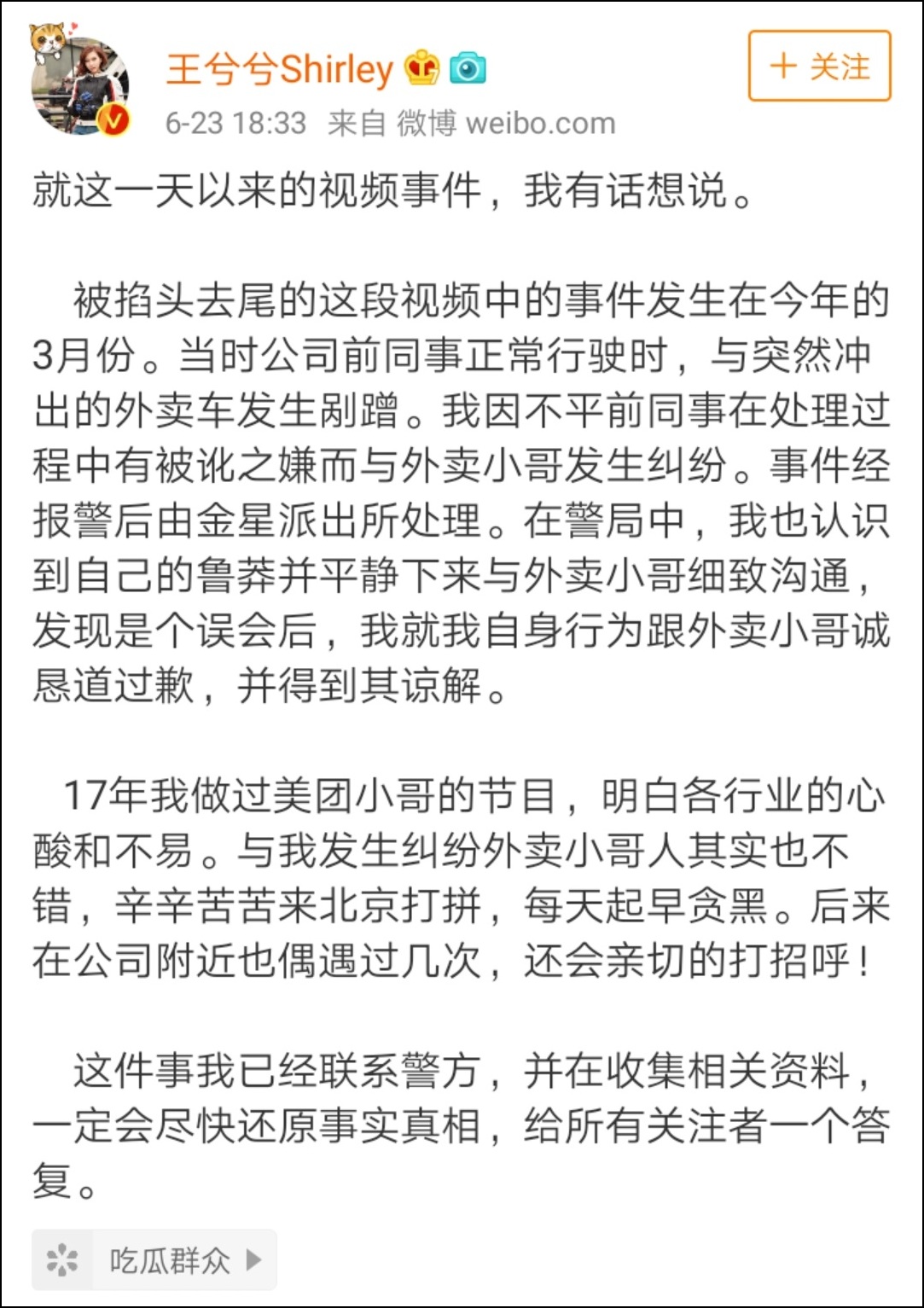稍晚時分,王兮兮稱事發於今年3月,視頻系掐頭去尾。當時已經得到了妥善解決,她意識到自己態度不好,在派出所時就已經向外賣小哥道歉並得到諒解。目前,她已經聯繫警方,收集相關資料,旨在還原事情真相。