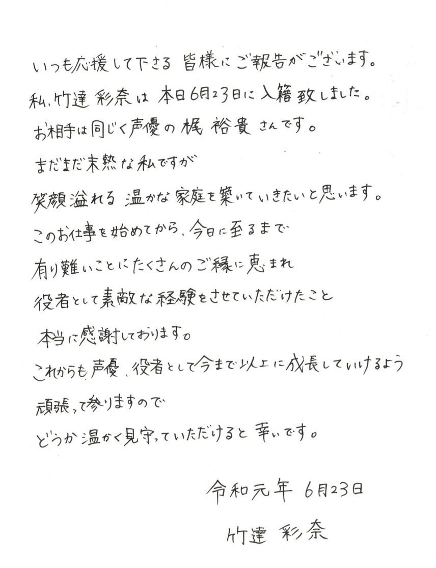 日本媒體報道,梶裕貴(33歲)與竹達彩奈(30歲)於23日宣佈結婚,今天正好是竹達彩奈的生日。兩人都是配音演員,由梶裕貴配音的經典角色包括「進擊的巨人」的艾連·葉卡、「黑執事」的菲尼安等,竹達彩奈則為「K-ON!」的中野梓,「五等分的新娘」的中野二乃等配過音。