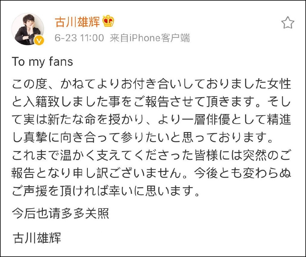 今天上午,古川雄輝通過微博向粉絲宣佈了自己已經結婚的事實。