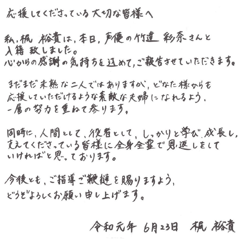 今天,日本知名聲優梶裕貴竹達彩奈官宣結婚