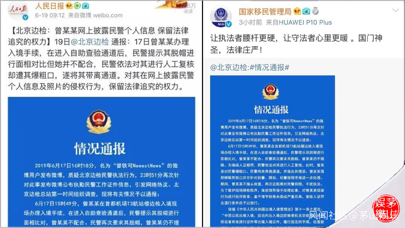 6月19日早上6:48分,北京邊檢官博就進行了通報,稱曾軼可不但不配合脱帽,還辱罵好心提醒她的民警,之後她不但不服從檢查還兩次近距離對民警拍照,期間還有爆粗口行為,對於她在網上披露民警個人信息及照片,對民警身心造成嚴重影響的侵權行為,保留法律追究的權力。國家移民管理局轉發了北京邊檢的通報並稱:“讓執法者腰桿更硬,讓守法者心裏更暖 。國門神聖,法律莊嚴!”人民日報、央視新聞、共青團中央等媒體紛紛發聲。