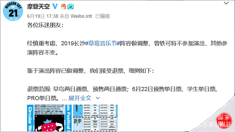 這是繼6月19日,曾軼可被經紀公司摩登天空緊急叫停取消其參加“2019長沙草莓音樂節”後,再一次被影響到的公開活動。6月19日下午17:38分,摩登天空官博發博稱:“各位樂迷朋友:經慎重考慮,2019長沙#草莓音樂節#陣容做調整,曾軼可將不參加演出,其他參演陣容不變。鑑於演出陣容已做調整,我們接受退票,細則如下:退票範圍: 早鳥兩日通票、預售兩日通票;6月22日預售單日票、學生單日票、PRO單日票。”